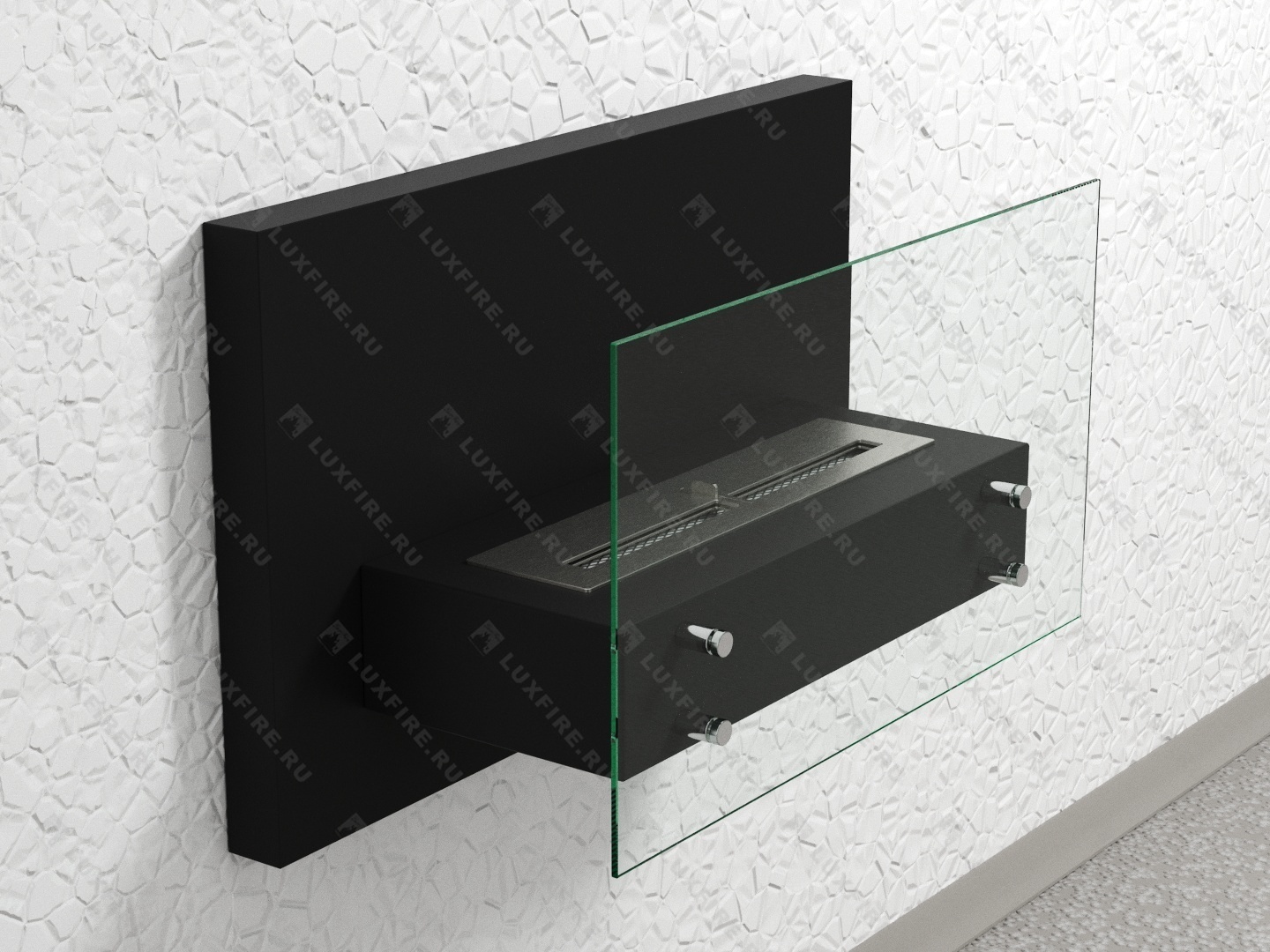 Представляет собой сборный металлический каркас с топливным блоком Lux Fire 500 М, закрепленный на 4 дистанционных держателях к защитному стеклу с подвесом к стене.