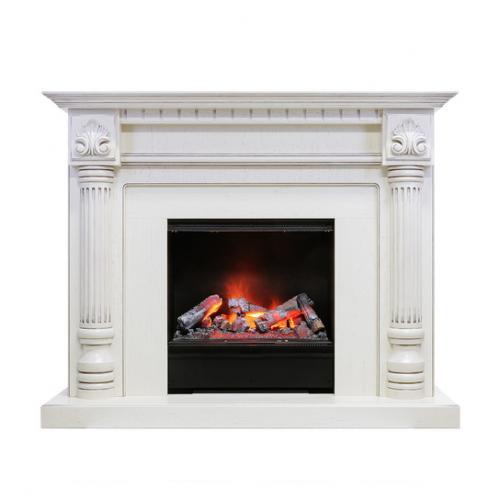 Портал каминокомплекта выполнен с использованием современного материала МДФ, основой для которого выступает измельченная до волокон древесина. За счет этого достигается высокая плотность материала, что дает возможность осуществления его резной обработки. Дополнительно декоративные качества портала достигаются за счет использования покрытия из натурального шпона. Его фактура и цвет имитируют поверхность слоновой кости. Подчеркнуть линии декора позволяет легкая патина. В функции шпона входит также защита основы от внешних негативных факторов, создаваемых перепадами температуры и влажности. При использовании парового очага это очень актуально.
