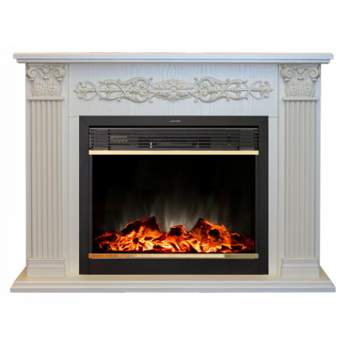 Очаг комплекта выполнен в современном стиле, но вполне вписывается в классическую конструкцию портала. Черный цвет разбавляет золотая рамка, обрамляющая непосредственно зону очага. Внутрь вставлен муляж дров и углей, оформленный подсветкой. Лицевая поверхность очага закрыта стеклом, что значительно облегчает процедуру ухода за изделием. В верхней части расположена решетка, под которой спрятаны элементы управления функциями очага. Внутренняя поверхность очага выполнена в черном цвете, на котором проекция огня выглядит максимально выгодно.